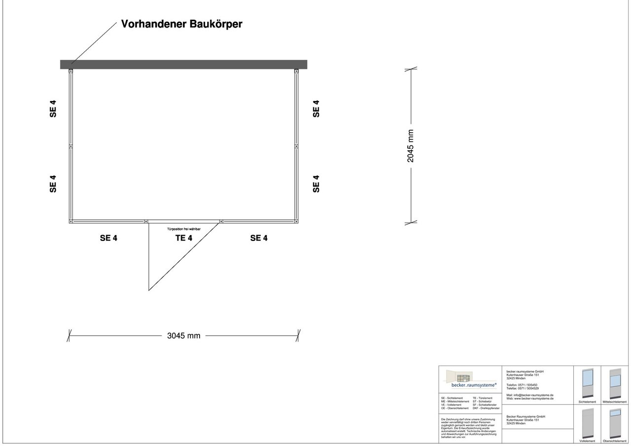 3-seitig, Abmessung: L x T = 3.045 x 2.050 mm, Innenmaß: L x T = 2.955 x 2.005 mm, lichte Raumhöhe 2.510 mm, Außenhöhe 2.677 mm