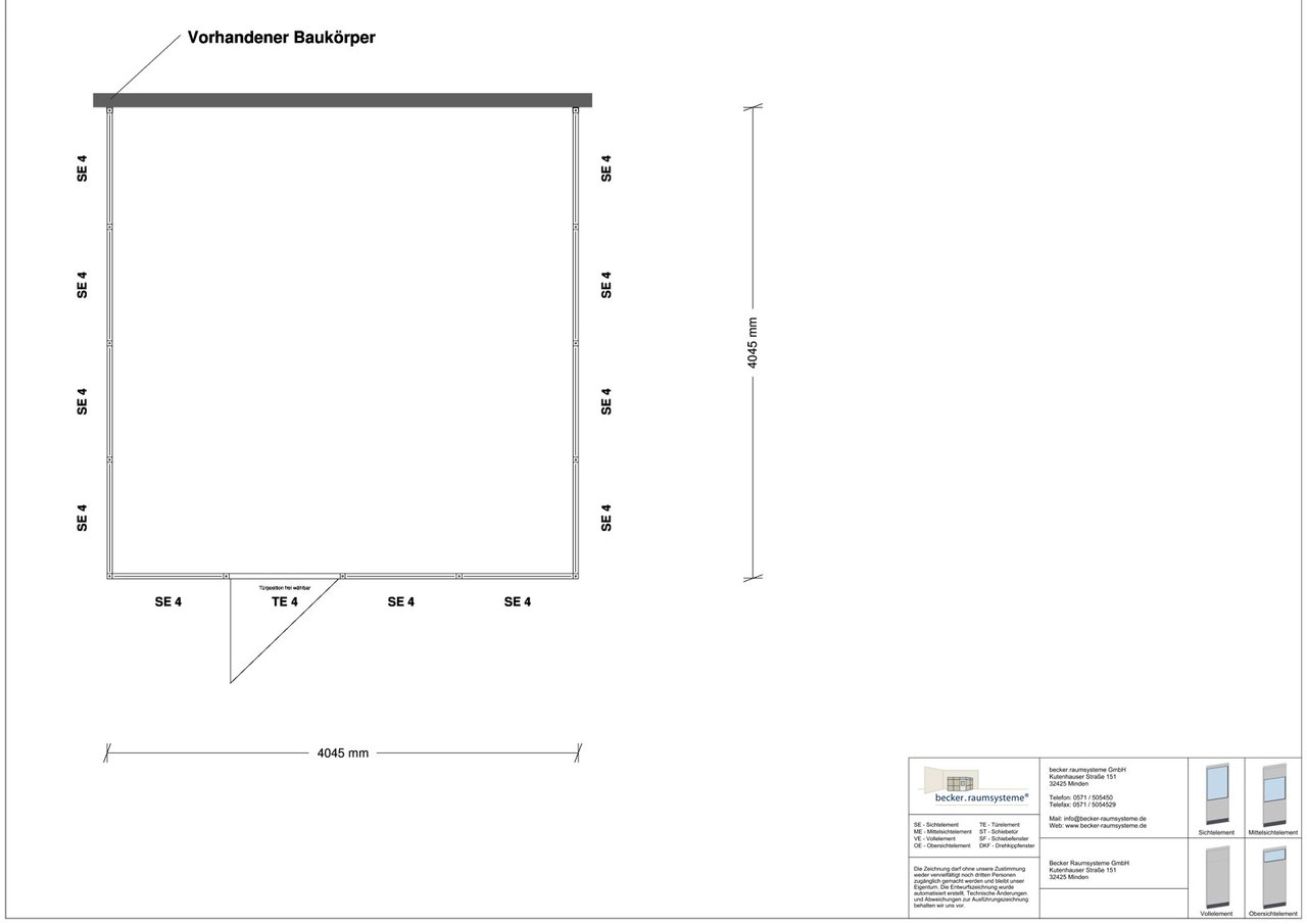 3-seitig, Abmessung: L x T = 4.045 x 4.050 mm, Innenmaß: L x T = 3.955 x 4.005 mm, lichte Raumhöhe 2.510 mm, Außenhöhe 2.677 mm