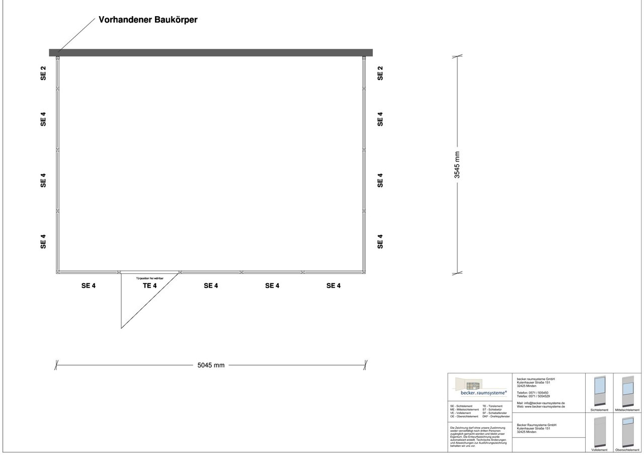 3-seitig, Abmessung: L x T = 5.045 x 3.550 mm, Innenmaß: L x T = 4.955 x 3.505 mm, lichte Raumhöhe 2.510 mm, Außenhöhe 2.677 mm