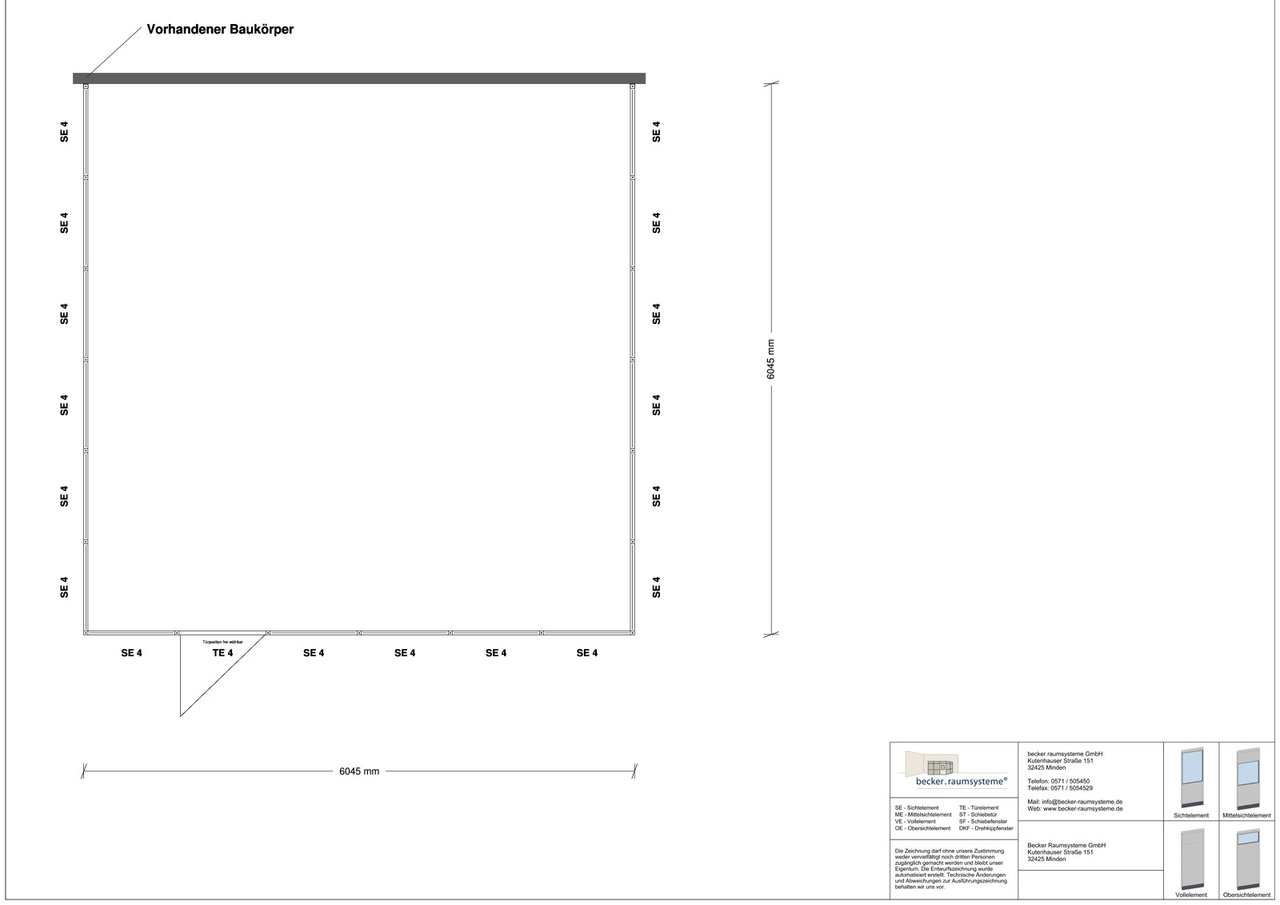 3-seitig, Abmessung: L x T = 6.045 x 6.050 mm, Innenmaß: L x T = 5.955 x 6.005 mm, lichte Raumhöhe 2.510 mm, Außenhöhe 2.677 mm