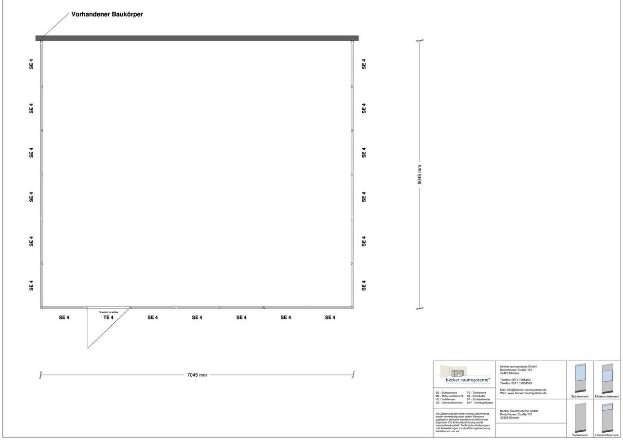 3-seitig, Abmessung: L x T = 7.045 x 6.050 mm, Innenmaß: L x T = 6.955 x 6.005 mm, lichte Raumhöhe 2.510 mm, Außenhöhe 2.677 mm