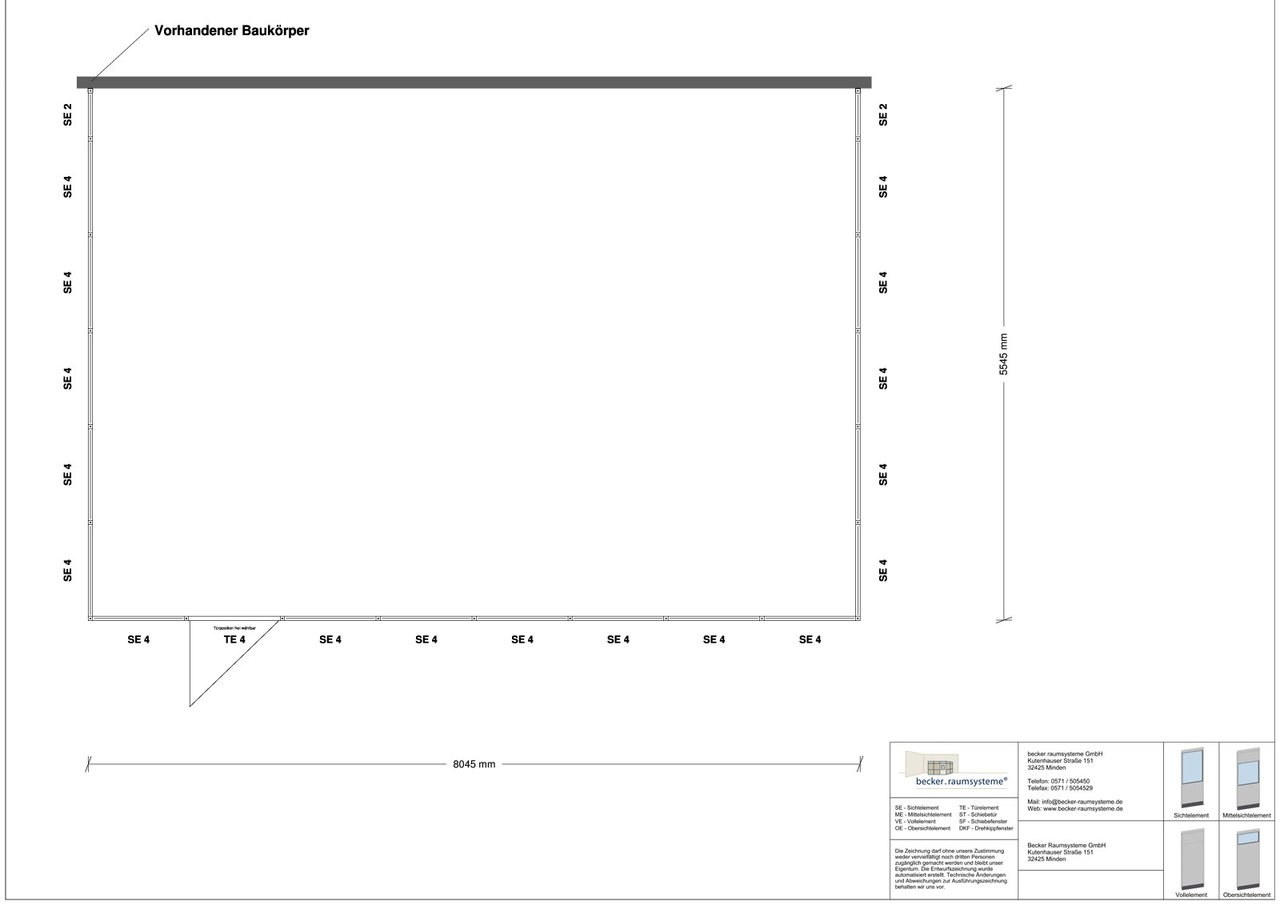 3-seitig, Abmessung: L x T = 8.045 x 5.550 mm, Innenmaß: L x T = 7.955 x 5.505 mm, lichte Raumhöhe 2.510 mm, Außenhöhe 2.677 mm