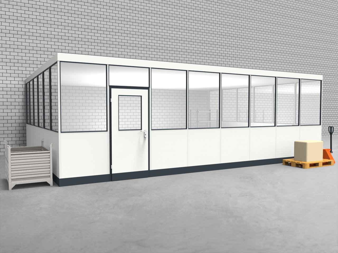 Das Hallenbüro HB3-8060 eignet sich hervorragend für verschiedene Anwendungen in industriellen Umgebungen - sei es als Besprechungsraum, Einzelbüro oder als Rückzugsort für konzentriertes Arbeiten inmitten des Produktionsgeschehens. Die Mineralfaserakustikdecke sorgt zudem für eine angenehme Geräuschdämmung, sodass Ihre Mitarbeiter ungestört arbeiten können.