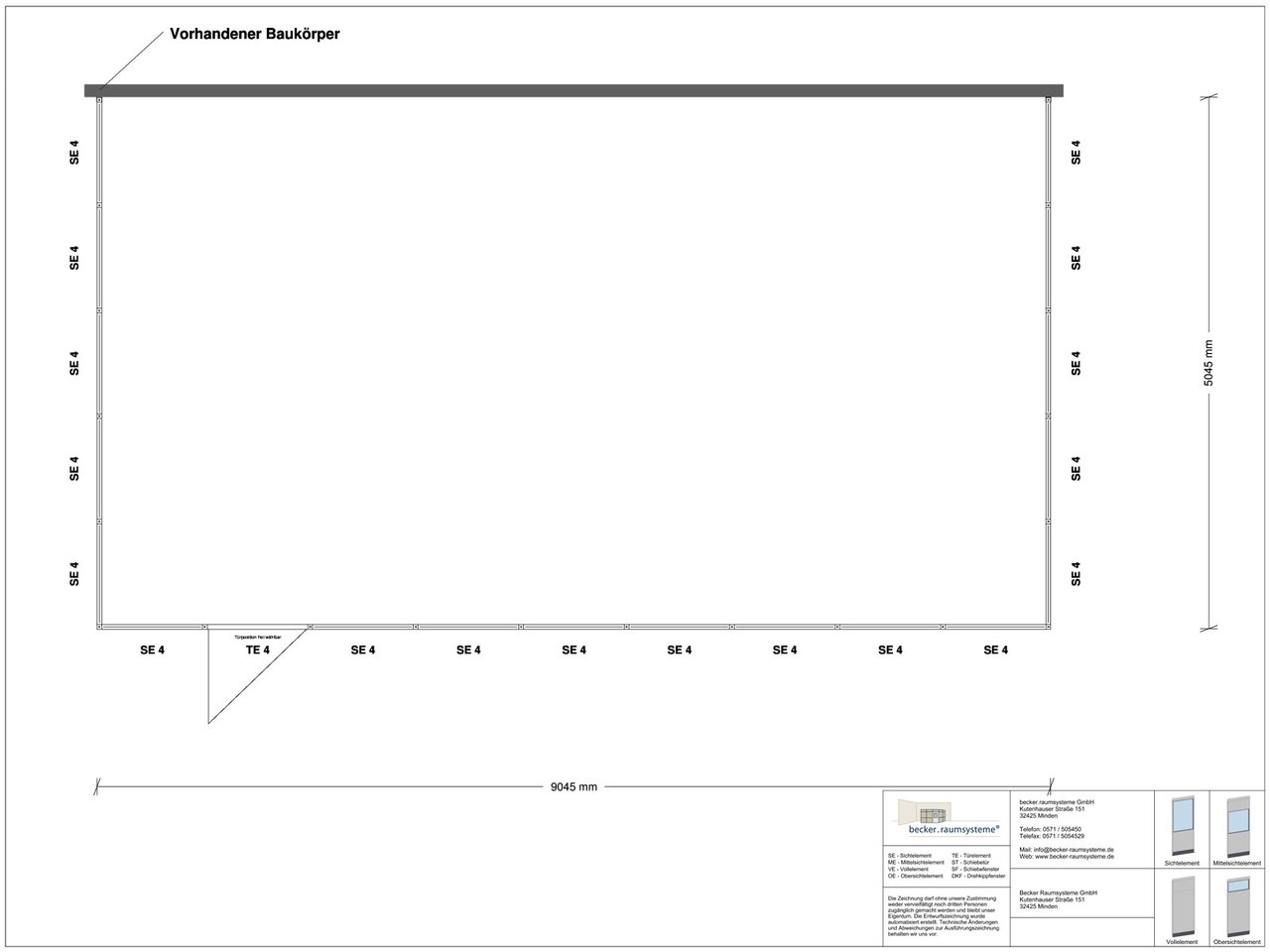 3-seitig, Abmessung: L x T = 9.045 x 5.050 mm, Innenmaß: L x T = 8.955 x 5.005 mm, lichte Raumhöhe 2.510 mm, Außenhöhe 2.677 mm