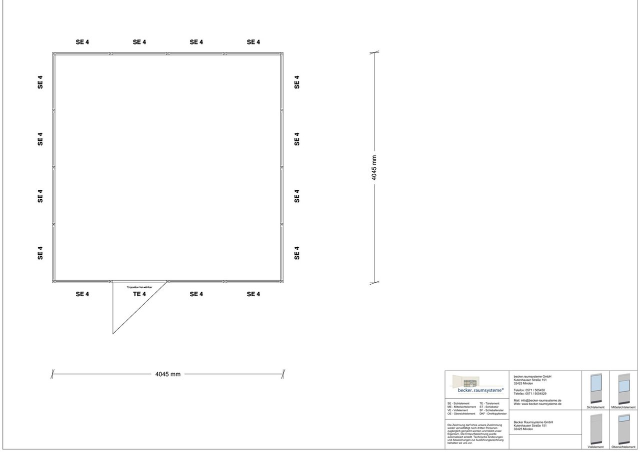 Die detaillierten Produktspezifikationen des Hallenbüros HB4-4040 umfassen eine Außenmaß von 4.045 x 4.045 mm und ein Innenmaß von 3.955 x 3.955 mm, bei einer lichten Raumhöhe von 2.510 mm und einer Außenhöhe von 2.677 mm. Diese Dimensionen garantieren ausreichend Platz für Ihre Mitarbeiter und deren Bedürfnisse.