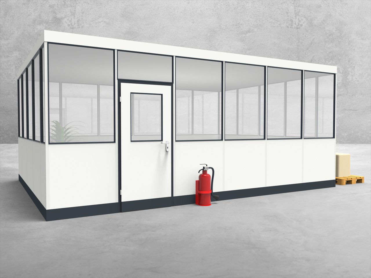 Ein herausragendes Merkmal des Hallenbüros ist die Möglichkeit, verschiedene Glastypen zu wählen, wodurch Sie das Design ganz nach Ihren Vorstellungen gestalten können. Die akustisch wirksame Mineralfaserakustikdecke sorgt zudem für eine angenehme Geräuschkulisse und trägt zur Konzentration Ihrer Mitarbeiter bei. Darüber hinaus wird das Büro mit einer robusten Metalltür ausgestattet, die einen professionellen Eindruck hinterlässt und gleichzeitig Sicherheit bietet. Die lichte Raumhöhe von 2.510 mm und die Außenhöhe von 2.677 mm sorgen dafür, dass sich Ihre Mitarbeiter in diesem Raum wohlfühlen und genug Bewegungsfreiheit haben.