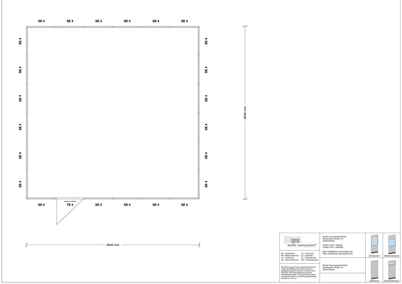Das Hallenbüro HB4-6060 bietet Ihnen eine maßgeschneiderte Lösung für Ihre Arbeitsumgebung, die sowohl Funktionalität als auch Ästhetik vereint. Mit einer großzügigen Grundfläche von 36 m² und den Abmessungen von 6.045 x 6.045 m schafft dieses freistehende Büro einen idealen Raum für konzentriertes Arbeiten. Durch seine modulare Bauweise können Sie das Büro flexibel an Ihre individuellen Bedürfnisse anpassen und so einen effektiven Arbeitsplatz schaffen, der den Anforderungen moderner industrieller Anwendungen gerecht wird.