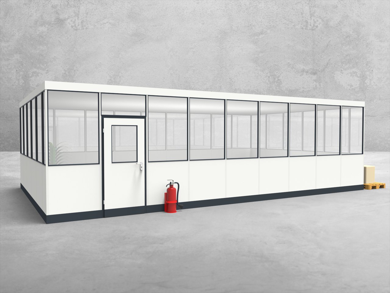 Das Hallenbüro HB4-9055 eignet sich hervorragend für verschiedene Anwendungen in der Industrie. Ob als Besprechungsraum, Rückzugsort für konzentriertes Arbeiten oder temporärer Arbeitsplatz - die Möglichkeiten sind vielfältig. Unternehmen im Bereich Produktion oder Lagerhaltung profitieren besonders von der Flexibilität dieses modulares Bürosystems, das sich problemlos in bestehende Strukturen integrieren lässt.