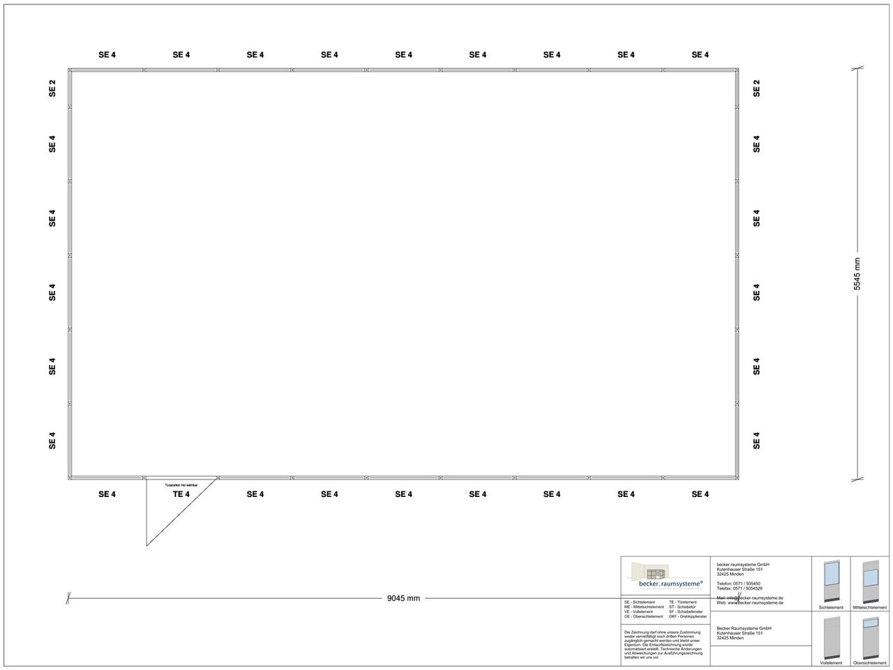 Die einzigartigen Argumente des Hallenbüros HB4-9055 sind unbestreitbar: Neben der Modularität und Flexibilität bietet dieses Produkt eine robuste Bauweise, die auf Langlebigkeit ausgelegt ist. Mit Abmessungen von 9.045 x 5.545 mm (Außenmaß) und einer lichten Raumhöhe von 2.510 mm sorgt das Büro für ein angenehmes Raumgefühl. Die Mineralfaserakustikdecke trägt zur Schallabsorption bei und schafft somit eine ruhige Arbeitsumgebung. Darüber hinaus wird die Tür mit einem Glasausschnitt sowie einem stabilen Metalltürblatt ausgestattet, wobei der DIN-Anschlag nach Absprache angepasst werden kann.