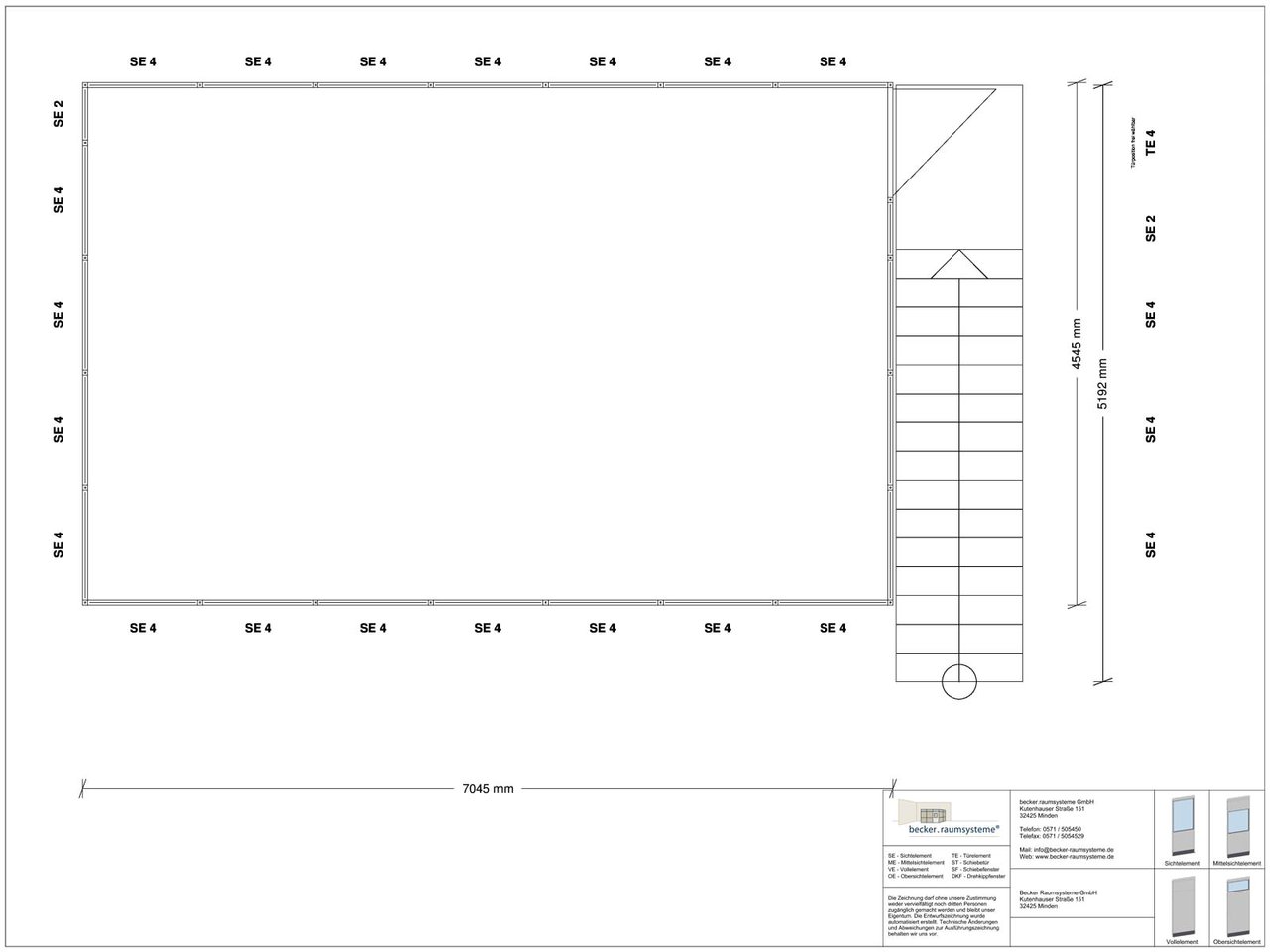 Die einzigartigen Argumente des Hallenbüros auf Stahlbau umfassen seine vierseitige Ausführung mit den Abmessungen von 7.045 x 4.545 mm sowie eine lichte Raumhöhe von 2.510 mm, die ausreichend Platz für eine komfortable Nutzung bietet. Die stabile Lagerbühne mit einer Höhe von 2.810 mm sorgt nicht nur für eine sichere Konstruktion, sondern ermöglicht auch eine einfache Montage durch unsere Montagepartner. Der hochwertige Bühnenbelag aus Spanplatte P6 in Kombination mit PVC-Fliesen in Anthrazit gewährleistet Langlebigkeit und einfache Pflege.