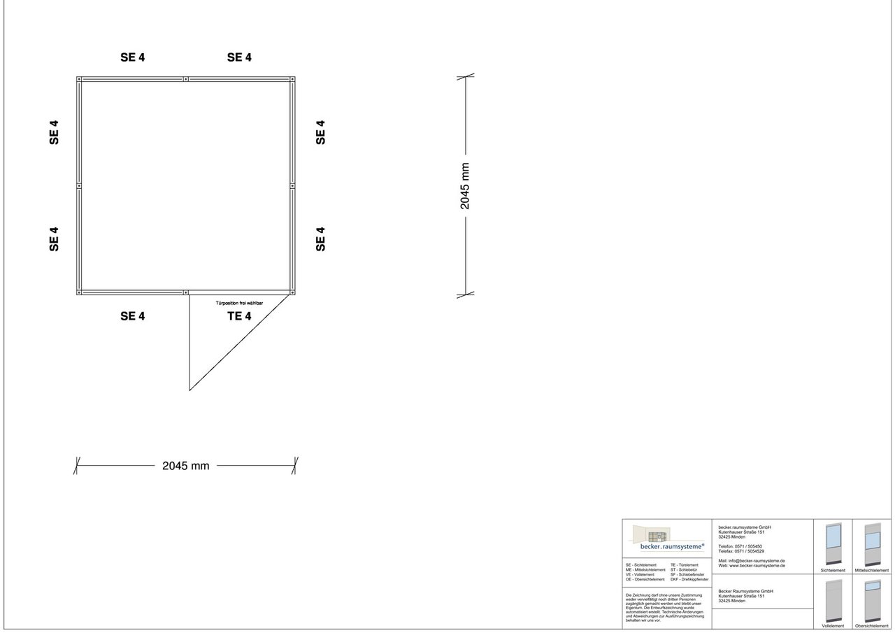 4-seitig, Abmessung: L x T = 2.045 x 2.045 mm, Innenmaß: L x T = 1.955 x 1.955 mm, lichte Raumhöhe 2.510 mm, Außenhöhe 2.844 mm