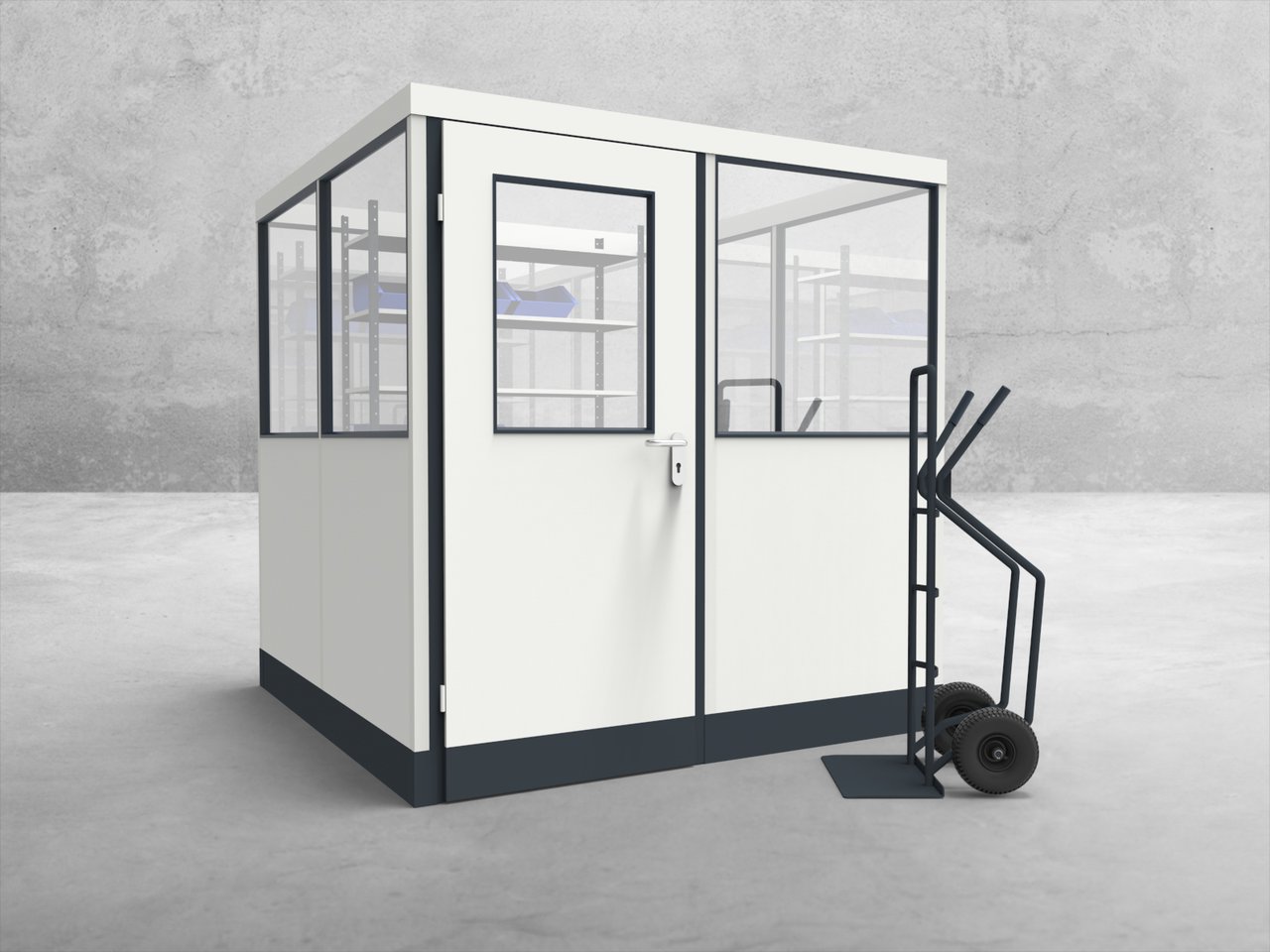 Einzigartig an dieser Stellwand ist die flexible Modularität, die es Ihnen ermöglicht, das Büro jederzeit an veränderte Anforderungen anzupassen. Die robuste Bauweise aus pulverbeschichteten Stahlteilen garantiert Langlebigkeit und Widerstandsfähigkeit gegen die Herausforderungen des industriellen Alltags. Darüber hinaus sorgt die lichte Raumhöhe von 2,510 mm für ein angenehmes Raumgefühl. Mit einer Außenhöhe von 2,677 mm fügt sich das Büro harmonisch in die bestehende Hallenstruktur ein und maximiert gleichzeitig den verfügbaren Platz.