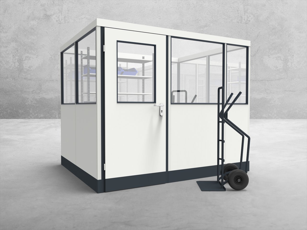 Einzigartig an dieser Stellwand ist die flexible Modularität, die es Ihnen ermöglicht, das Büro jederzeit an veränderte Anforderungen anzupassen. Die robuste Bauweise aus pulverbeschichteten Stahlteilen garantiert Langlebigkeit und Widerstandsfähigkeit gegen die Herausforderungen des industriellen Alltags. Darüber hinaus sorgt die lichte Raumhöhe von 2,510 mm für ein angenehmes Raumgefühl. Mit einer Außenhöhe von 2,677 mm fügt sich das Büro harmonisch in die bestehende Hallenstruktur ein und maximiert gleichzeitig den verfügbaren Platz.