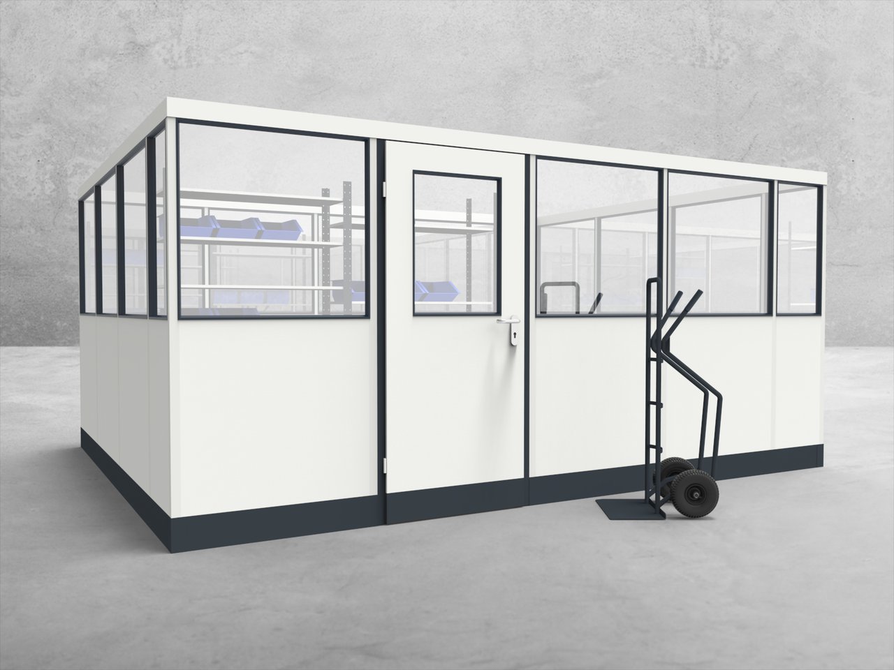 Die Stellwand SW4-4535 bietet Ihnen eine innovative Lösung, um Ihre Arbeitsumgebung optimal zu gestalten. Mit seinen kompakten Abmessungen von 4,5 x 3,5 m und einer großzügigen lichte Raumhöhe von 2.510 mm schafft es einen hellen und einladenden Raum, der sowohl Effizienz als auch Komfort fördert. Durch die modulare Bauweise passt sich dieses Büro flexibel an Ihre individuellen Bedürfnisse an und ermöglicht es Ihnen, Veränderungen in Ihrer Produktionsumgebung schnell und unkompliziert umzusetzen.