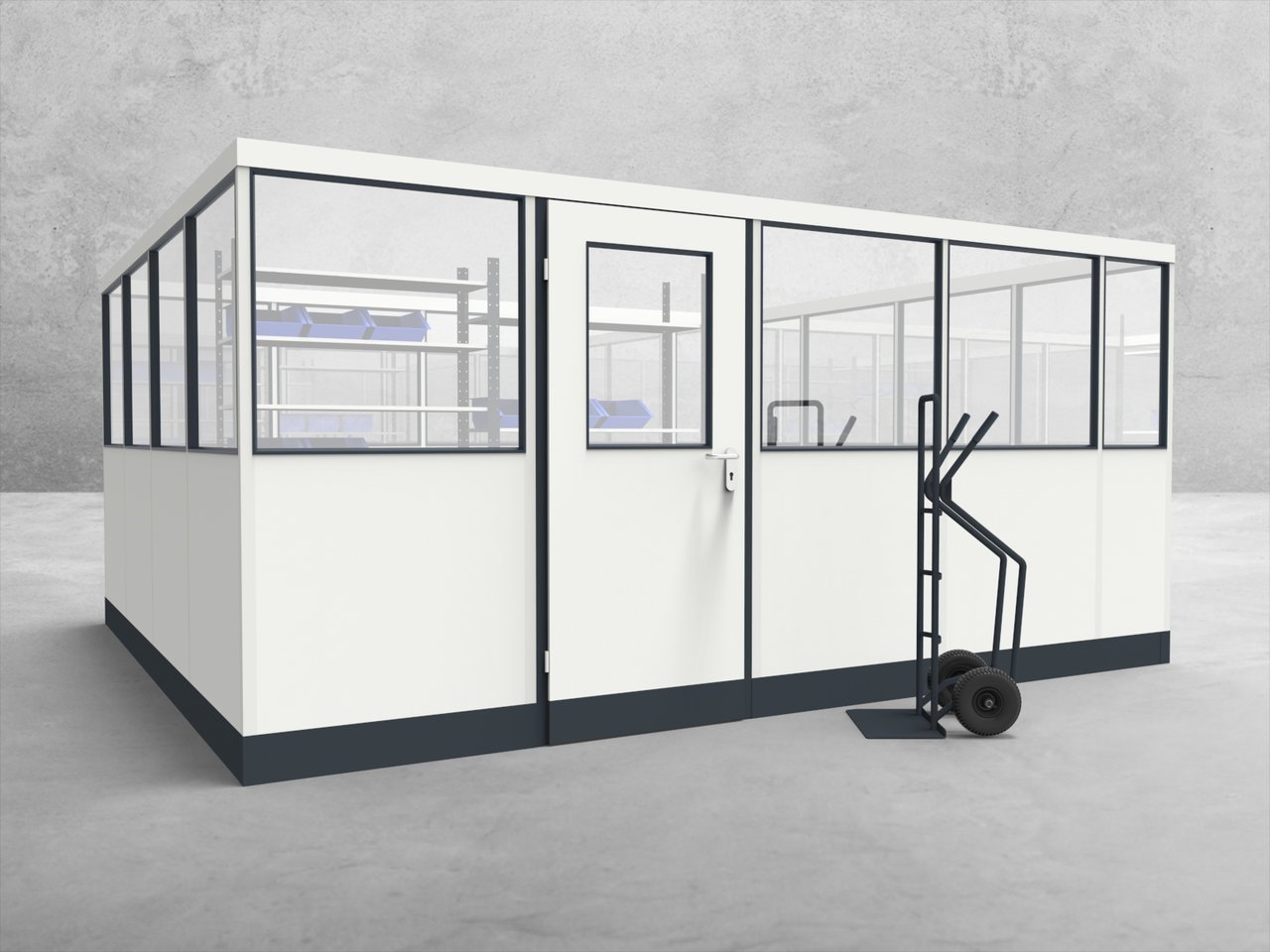 Einzigartig an dieser Stellwand ist die flexible Modularität, die es Ihnen ermöglicht, das Büro jederzeit an veränderte Anforderungen anzupassen. Die robuste Bauweise aus pulverbeschichteten Stahlteilen garantiert Langlebigkeit und Widerstandsfähigkeit gegen die Herausforderungen des industriellen Alltags. Darüber hinaus sorgt die lichte Raumhöhe von 2,510 mm für ein angenehmes Raumgefühl. Mit einer Außenhöhe von 2,677 mm fügt sich das Büro harmonisch in die bestehende Hallenstruktur ein und maximiert gleichzeitig den verfügbaren Platz.