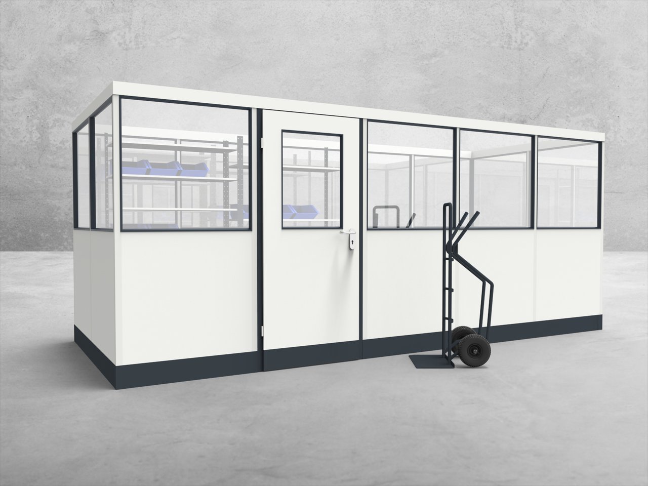 Einzigartig an dieser Stellwand ist die flexible Modularität, die es Ihnen ermöglicht, das Büro jederzeit an veränderte Anforderungen anzupassen. Die robuste Bauweise aus pulverbeschichteten Stahlteilen garantiert Langlebigkeit und Widerstandsfähigkeit gegen die Herausforderungen des industriellen Alltags. Darüber hinaus sorgt die lichte Raumhöhe von 2,510 mm für ein angenehmes Raumgefühl. Mit einer Außenhöhe von 2,677 mm fügt sich das Büro harmonisch in die bestehende Hallenstruktur ein und maximiert gleichzeitig den verfügbaren Platz.