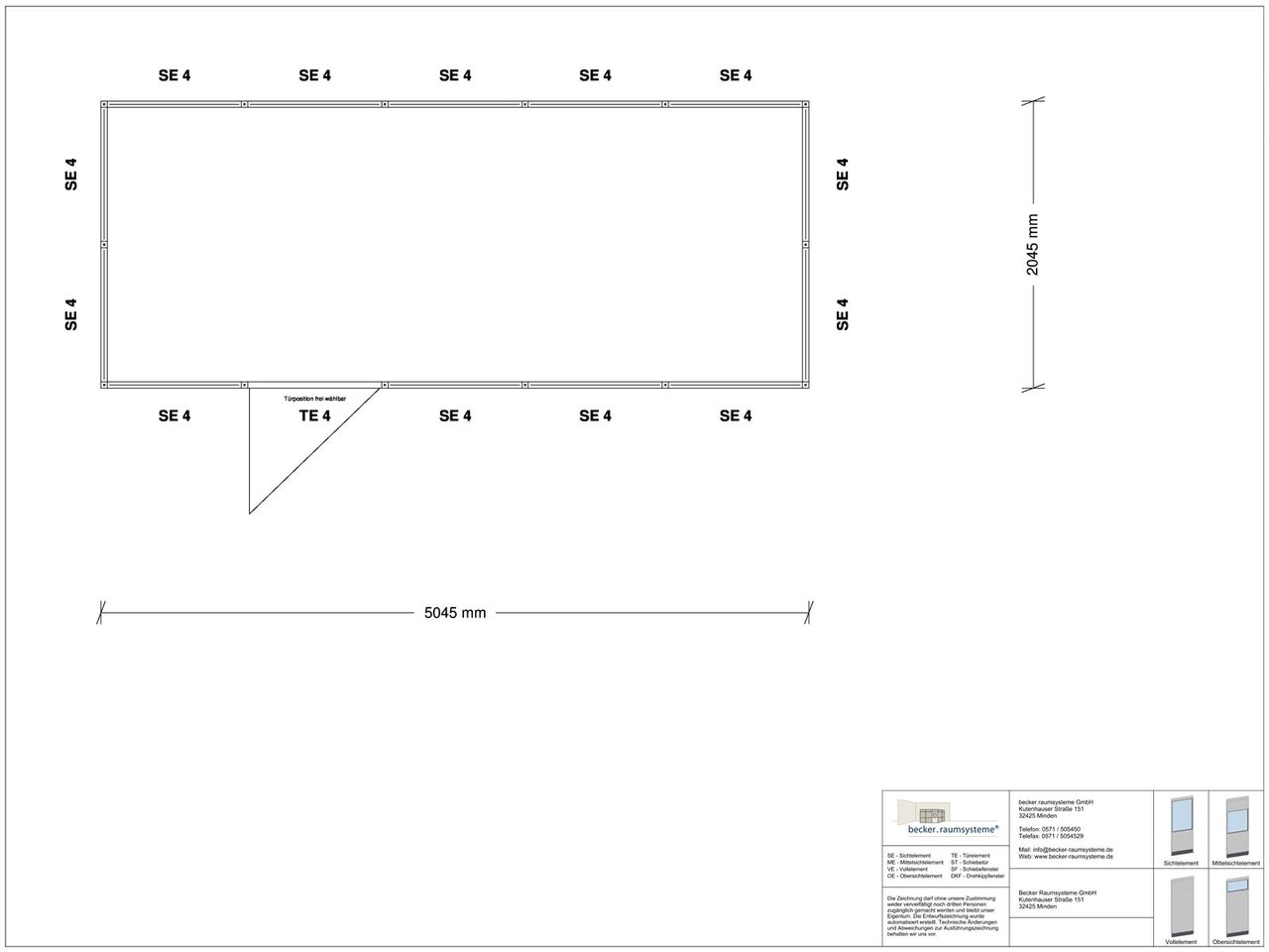 4-seitig, Abmessung: L x T x H = 5.045 x 2.045 x 2.100 mm, Innenmaß: L x T = 4.955 x 1.955 mm, Ausführung: freistehend ohne Deckenanschluss, mit Stabilisierungsprofil und Stützelementen