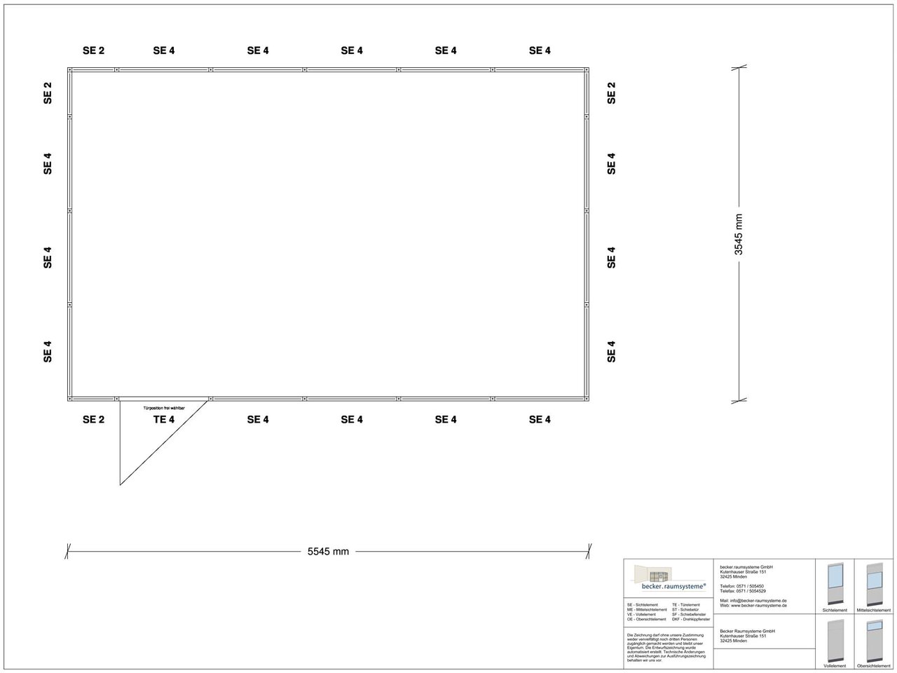 4-seitig, Abmessung: L x T x H = 5.545 x 3.545 x 2.100 mm, Innenmaß: L x T = 5.455 x 3.455 mm, Ausführung: freistehend ohne Deckenanschluss, mit Stabilisierungsprofil und Stützelementen