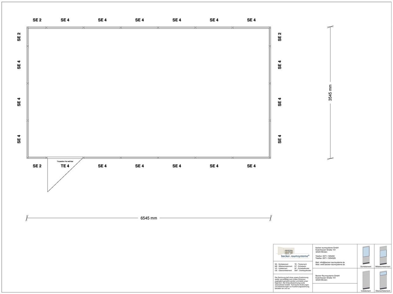 4-seitig, Abmessung: L x T x H = 6.545 x 3.545 x 2.100 mm, Innenmaß: L x T = 6.455 x 3.455 mm, Ausführung: freistehend ohne Deckenanschluss, mit Stabilisierungsprofil und Stützelementen