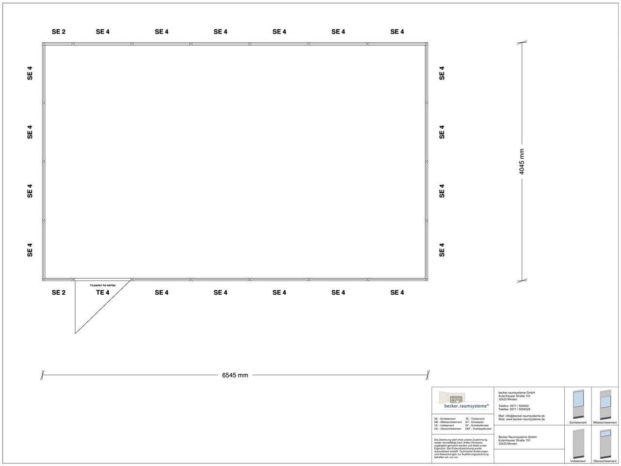 4-seitig, Abmessung: L x T x H = 6.545 x 4.045 x 2.100 mm, Innenmaß: L x T = 6.455 x 3.955 mm, Ausführung: freistehend ohne Deckenanschluss, mit Stabilisierungsprofil und Stützelementen
