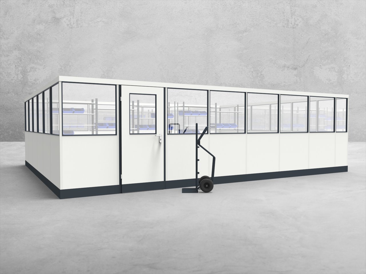 Einzigartig an dieser Stellwand ist die flexible Modularität, die es Ihnen ermöglicht, das Büro jederzeit an veränderte Anforderungen anzupassen. Die robuste Bauweise aus pulverbeschichteten Stahlteilen garantiert Langlebigkeit und Widerstandsfähigkeit gegen die Herausforderungen des industriellen Alltags. Darüber hinaus sorgt die lichte Raumhöhe von 2,510 mm für ein angenehmes Raumgefühl. Mit einer Außenhöhe von 2,677 mm fügt sich das Büro harmonisch in die bestehende Hallenstruktur ein und maximiert gleichzeitig den verfügbaren Platz.