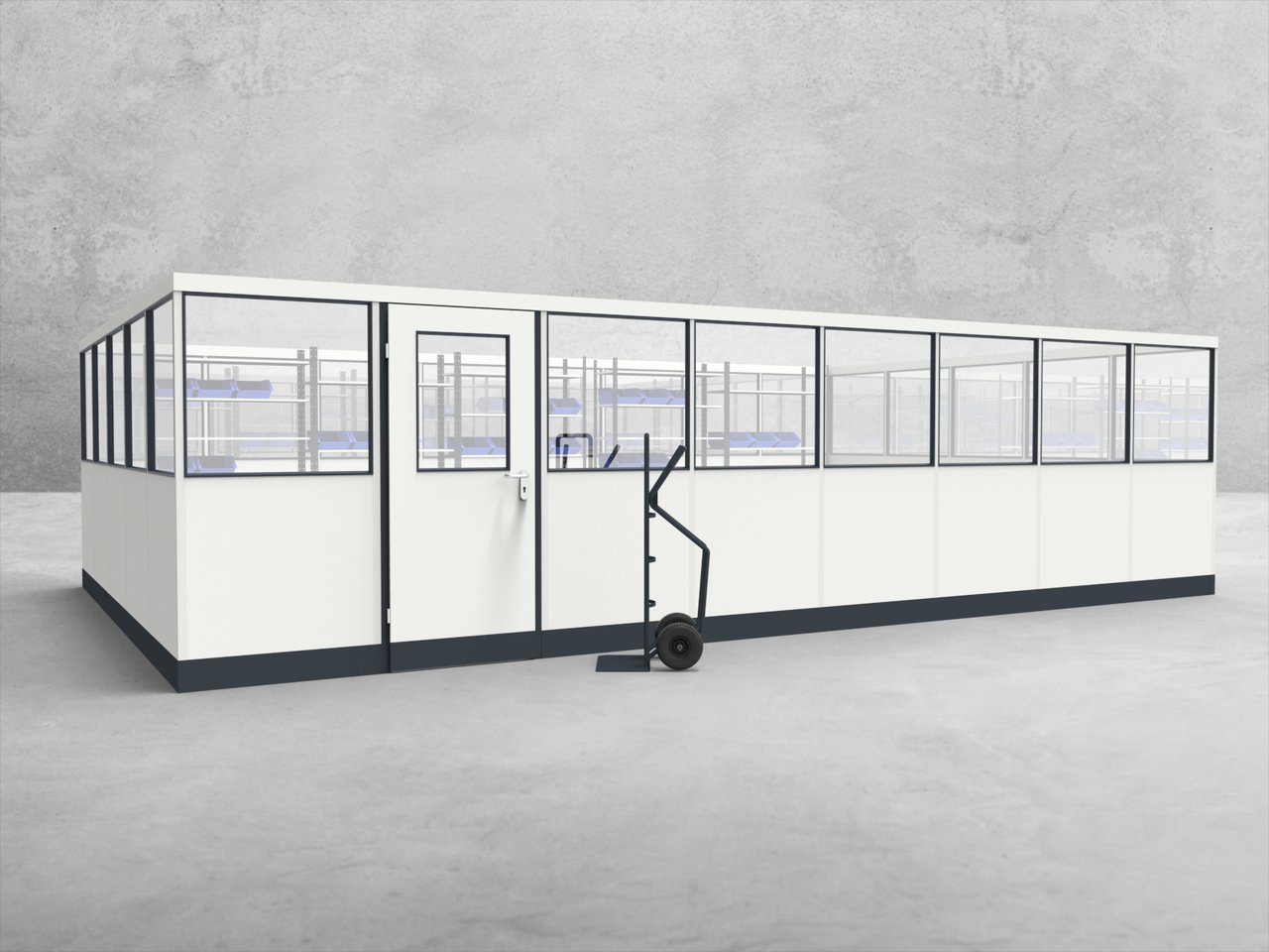 Einzigartig an dieser Stellwand ist die flexible Modularität, die es Ihnen ermöglicht, das Büro jederzeit an veränderte Anforderungen anzupassen. Die robuste Bauweise aus pulverbeschichteten Stahlteilen garantiert Langlebigkeit und Widerstandsfähigkeit gegen die Herausforderungen des industriellen Alltags. Darüber hinaus sorgt die lichte Raumhöhe von 2,510 mm für ein angenehmes Raumgefühl. Mit einer Außenhöhe von 2,677 mm fügt sich das Büro harmonisch in die bestehende Hallenstruktur ein und maximiert gleichzeitig den verfügbaren Platz.